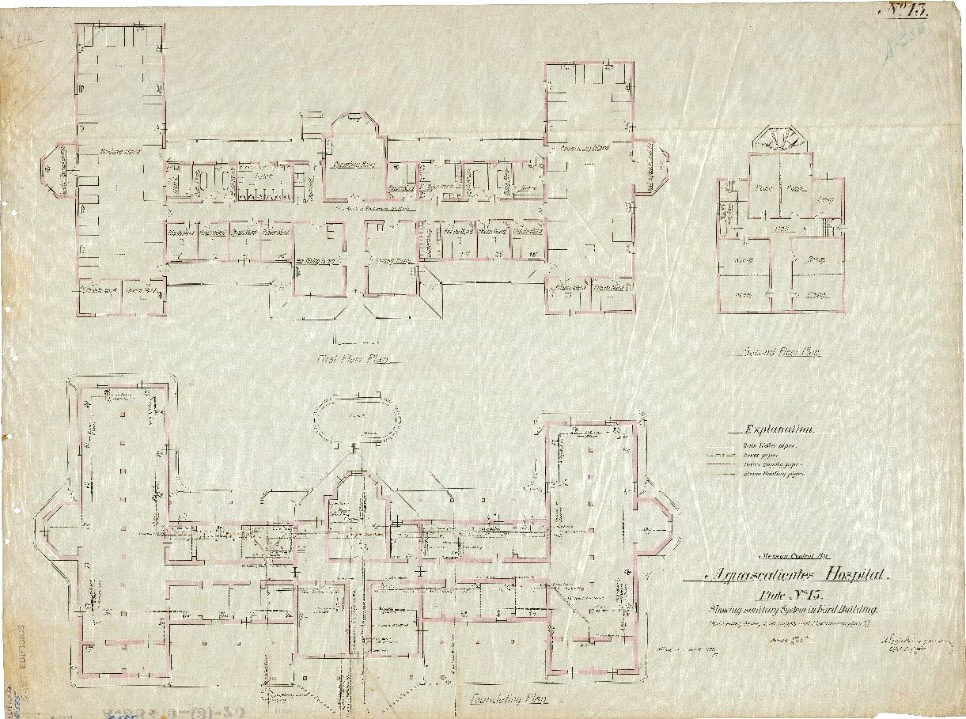 Los planos de hospitales se encuentran en la sección de Edificios; la temporalidad de los planos referentes a hospitales abarca desde finales del siglo XIX a mediados del siglo XX, con mayor precisión del año 1897 a 1940. Asimismo, existen algunos otros planos que no están fechados, pero que dan fe de la infraestructura hospitalaria. A continuación, se muestran algunas de las imágenes que se pueden encontrar en la sección mencionada del CEDIF: